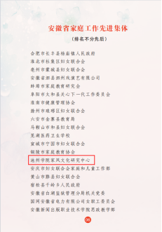 近日,安徽省妇女联合会发布安徽省五好家庭暨家庭工作先进集体、先进个人名单,我校家风文化研究中心被推选为安徽省家庭工作先进集体。