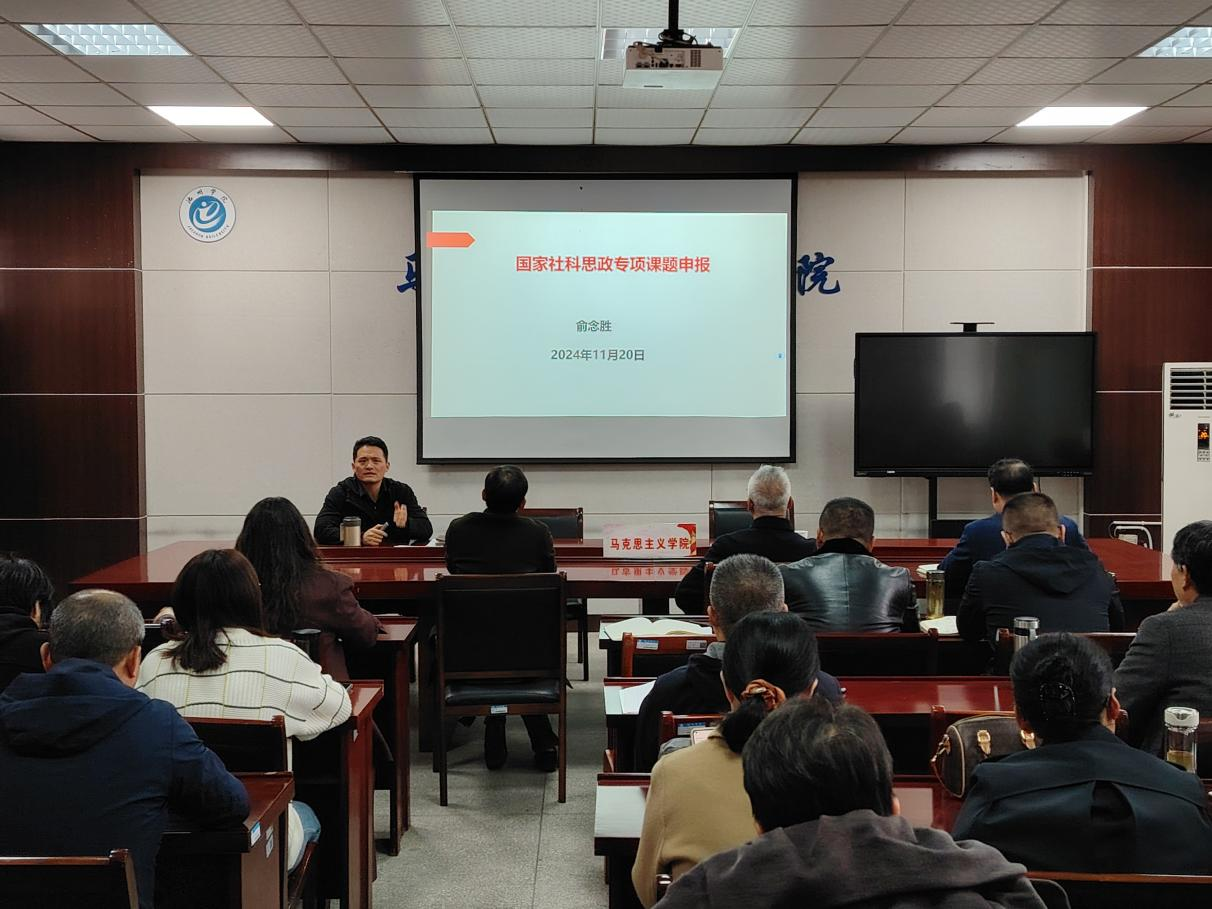 11月20日,太阳集团tyc539MACAU开展国家社科基金高校思想政治理论课研究专项(以下简称国社科思政专项)项目申报指导交流活动。学院党委书记俞念胜作了关于国社科思政专项申报的专题讲座。副院长鲍红信主持讲座,全院思政课教师参加活动。