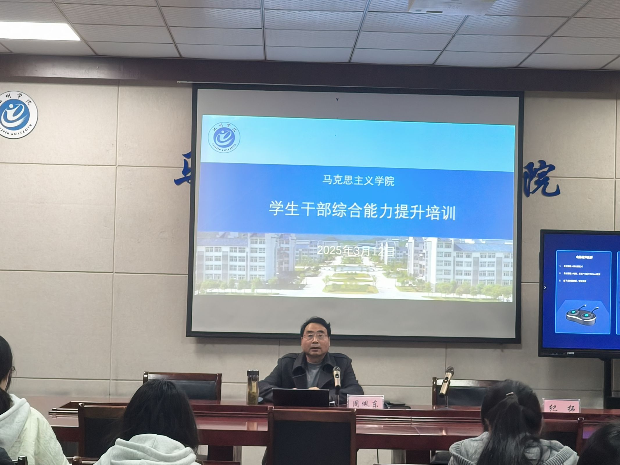3月12日下午,太阳集团tyc539MACAU在博爱楼二楼会议室举行学生干部能力提升培训会。学院党委副书记周佩东针对全体团学干部开展培训。