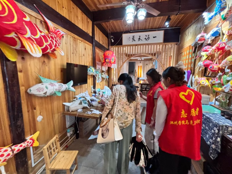 徽商古道上的石板路与古建筑,历史悠久。在渔梁古镇,实践团成员们聆听了当地老人讲述的徽商故事,并亲身体验了“渔梁鱼灯”等非遗文化。非遗传承人现场展示了“鱼梁鱼灯”的精湛制作技艺,一盏盏栩栩如生的鱼形灯彩在风中摇曳。成员们了解到,嬉鱼灯源于祈福镇灾的传统。历史上,作为商贾云集之地的渔梁,徽商们正是通过嬉鱼灯活动,祈求贸易顺利与家人平安。这些生动的历史遗存和民间技艺,有力印证了徽商对徽州地区民俗发展的促进作用,以及其为徽州文化形成发展所做出的巨大贡献。通过此行,成员们深刻体会到徽商精神中“贾而好儒”的文化底蕴与敢为人先的开拓勇气。