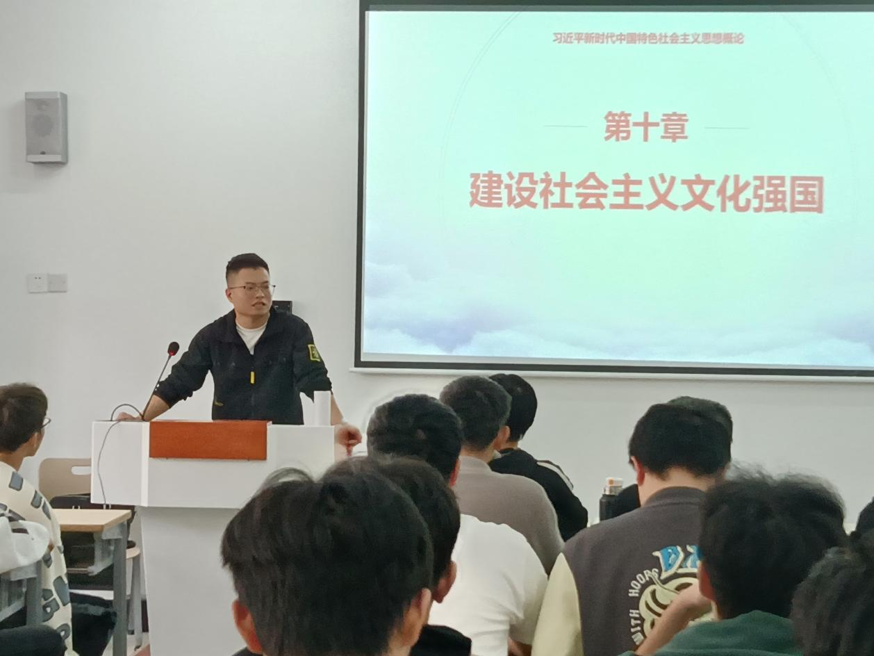 吴磊授课的主题为《习近平新时代中国特色社会主义思想概论》第十章第一节“文化是民族生存和发展的重要力量”。他深入剖析了文化自信的内涵,并详细讲解了如何坚定中国特色社会主义文化自信。吴磊的讲授不仅为在场师生提供了深刻的知识理解,也为思政课的教学提供了新的视角和思考。